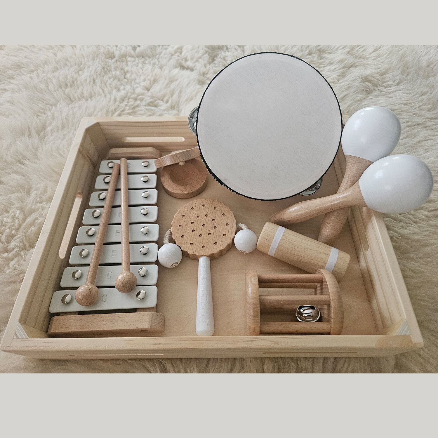 This 8-piece wooden music set comes with a xylophone, castanets, tambourine, spin drum, maracas, and two different shakers that produce different sounds. They are packed in a wooden tray for easy storage and retrieval. Tray measures 26.7cm x 6.5cm x 34.5cm.